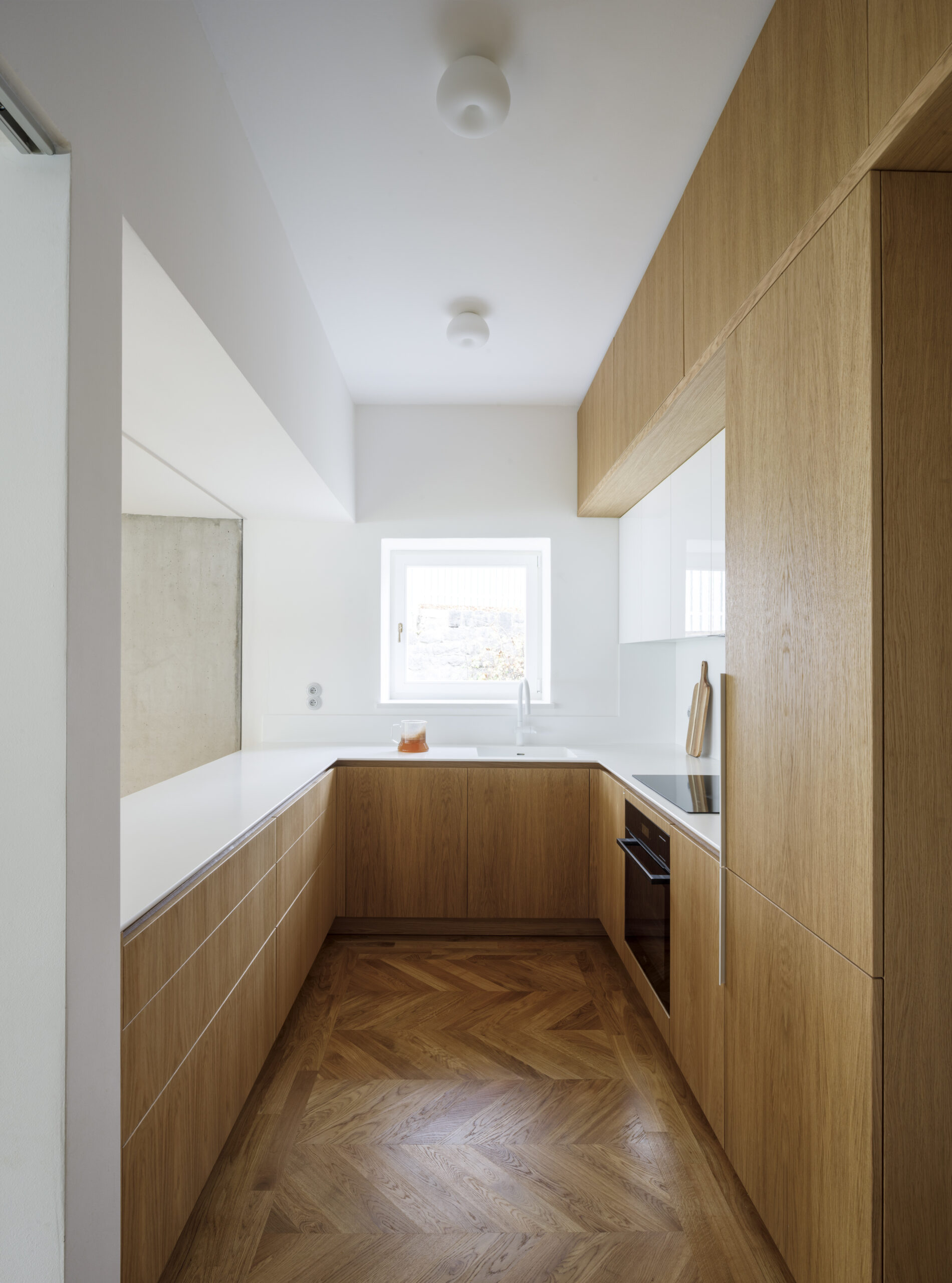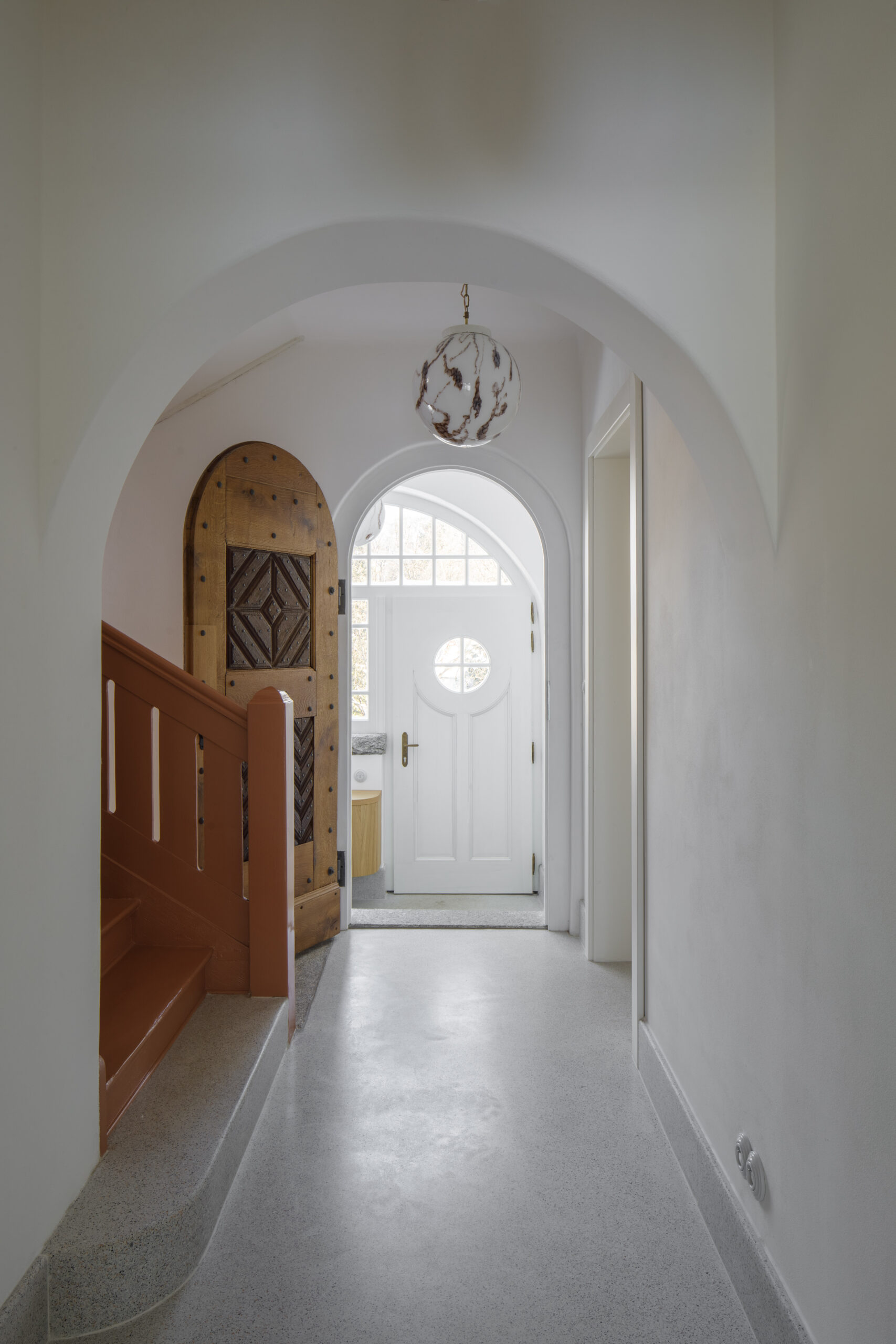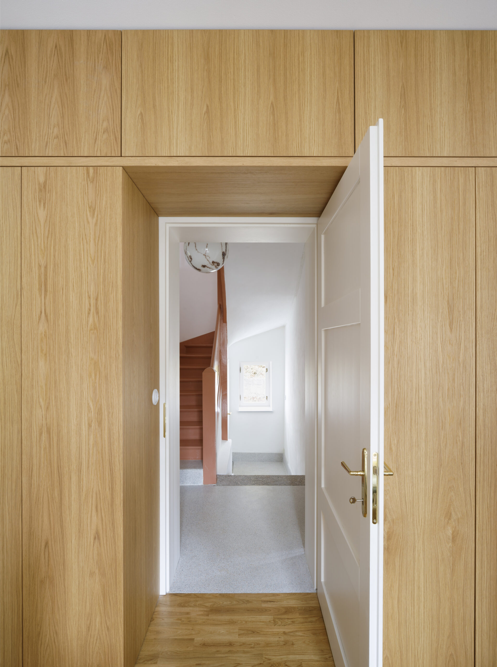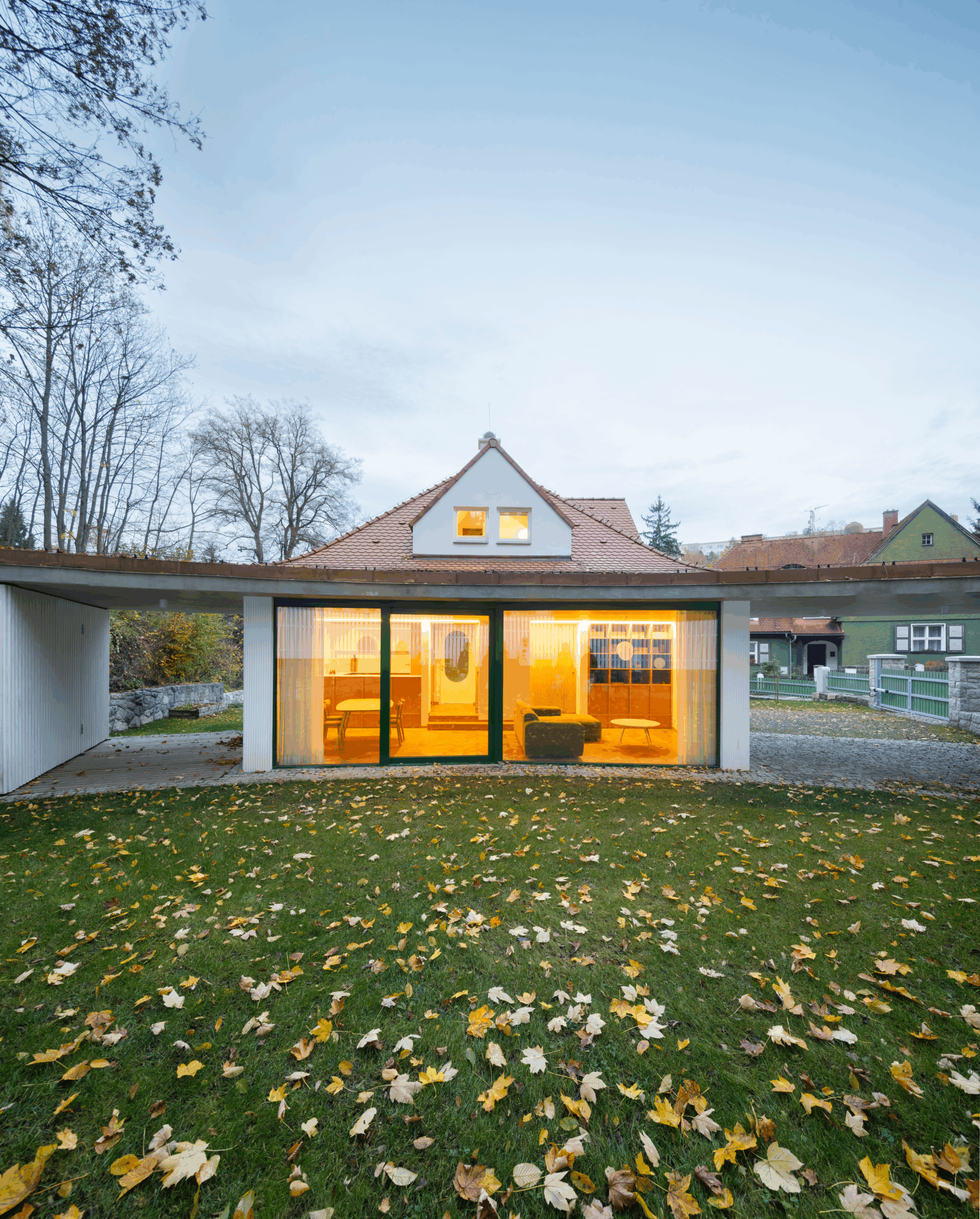 a naplno jej využívá, hmotově je ale nenápadné, kontextuální a z ulice téměř neviditelné. Pomáhá tomu i mírné zkosení zdí přístavby pod úhlem, které tak posiluje pozici hlavní hmoty původního domu.