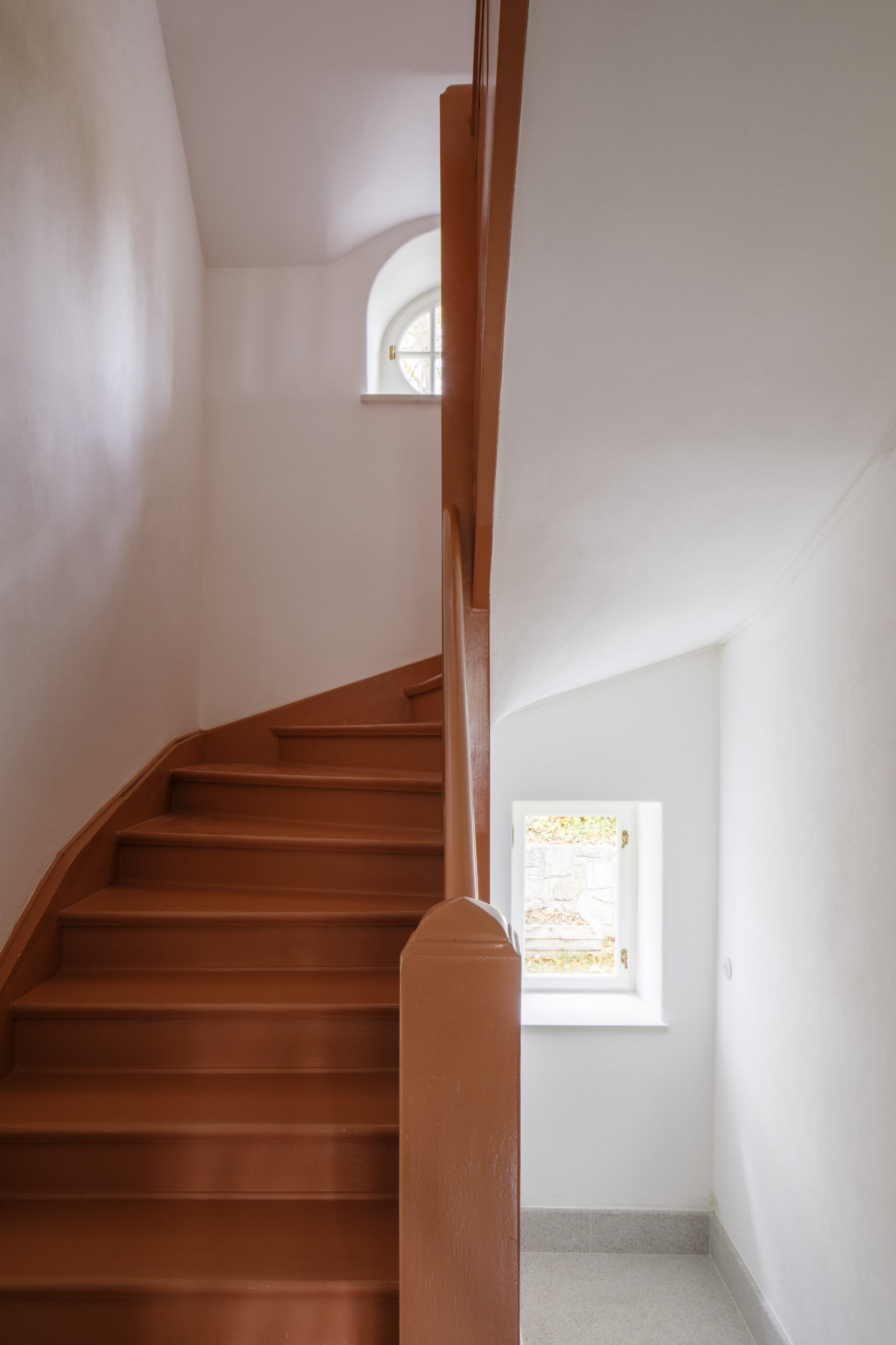 a z ulice téměř neviditelné. Pomáhá tomu i mírné zkosení zdí přístavby pod úhlem, které tak posiluje pozici hlavní hmoty původního domu.